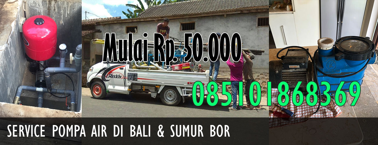 Selamat datang di website Service Pompa Air di Bali. Kami adalah profesional Service Pompa Air dan Pembuatan Sumur Bor yang melayani seluruh area Bali dengan harga mulai Rp.50.000 untuk service. Selain harga murah kami juga memberikan garansi service sehingga anda tidak perlu khawatir dengan mesin pompa air anda yang rewel. Pompa Air di jaman sekarang sangatlah diperlukan di berbagai kalangan seperti perkantoran, sekolah, industri maupun rumahan jadi jangan ragu untuk menghubungi kami, pelayanan adalah prioritas kami. Bengkel/cabang kami ada di beberapa daerah diantaranya Imam Bonjol, Kerobokan, Batubulan, Jimbaran, Ubud dan Panjer. Kami Service Pompa Air di Bali siap membantu anda jika ingin berkonsultasi dengan kami silahkan kontak kami di bawah ini.